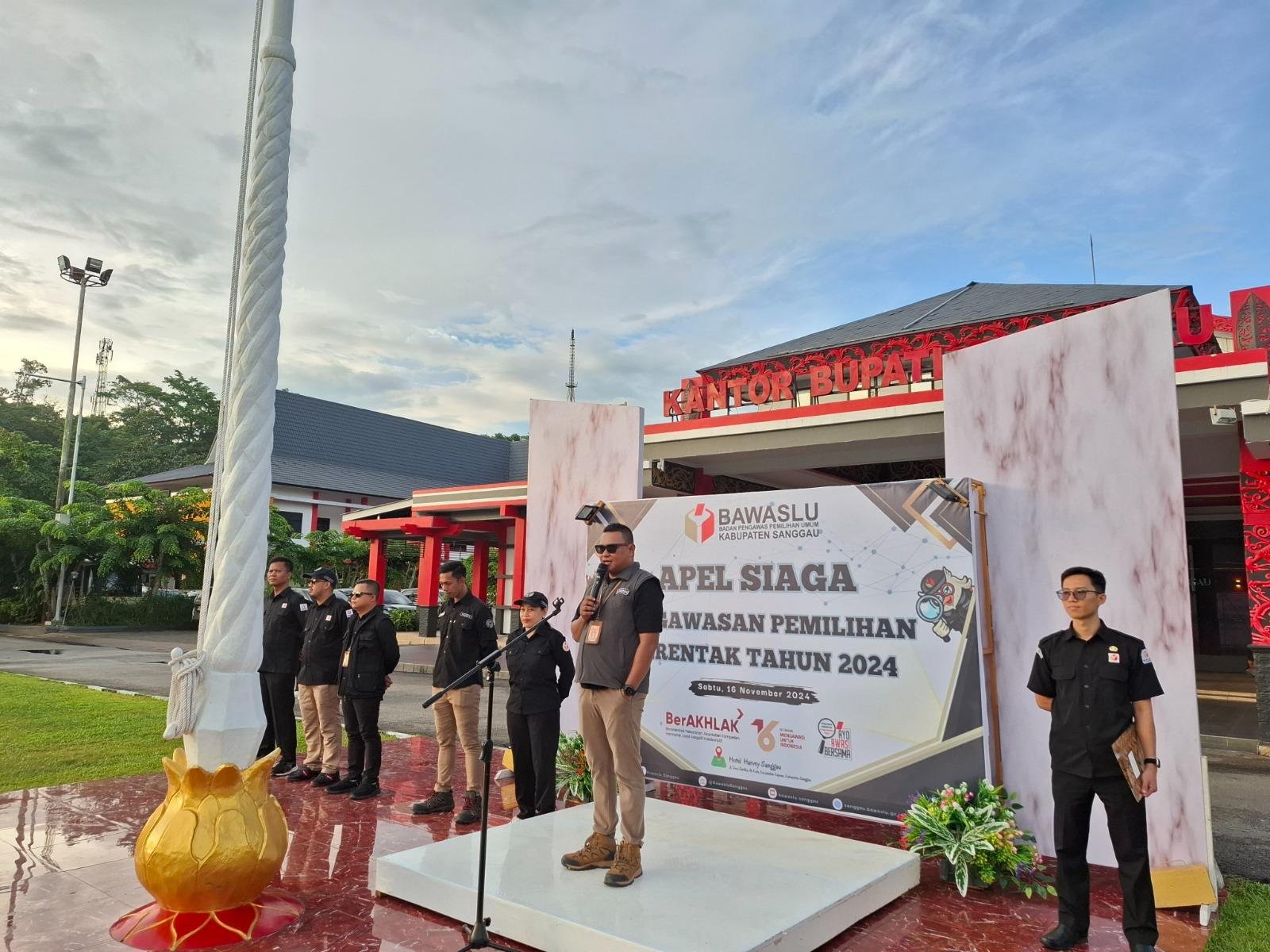 Badan Pengawas Pemilu (Bawaslu) Kabupaten Sanggau menggelar apel siaga tahapan pengawasan pemilihan serentak tahun 2024 di Halaman Kantor Bupati Sanggau, Sabtu (16/11).