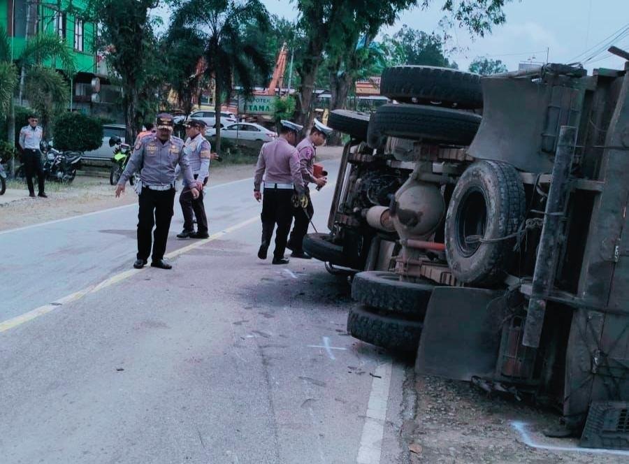 Tak berhenti di situ, truk yang oleng ke kanan kembali menabrak sepeda motor Honda KB 6875 DI yang dikendarai Nurtiati, SE, yang melaju dari arah berlawanan. Truk kemudian tumbang ke sisi kanan jalan, tepat di depan Aming Coffee.