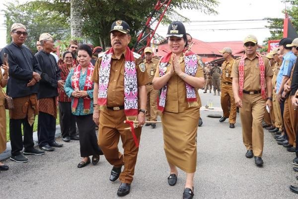 Sanggau, ZONA Kalbar.id – Bupati Sanggau, Yohanes Ontot dan Wakil Bupati Sanggau, Susana Herpena menerima penyambutan resmi melalui prosesi adat yang penuh makna di Jalan Jenderal Sudirman, Kelurahan Beringin, Kecamatan Kapuas. Senin (3/3).