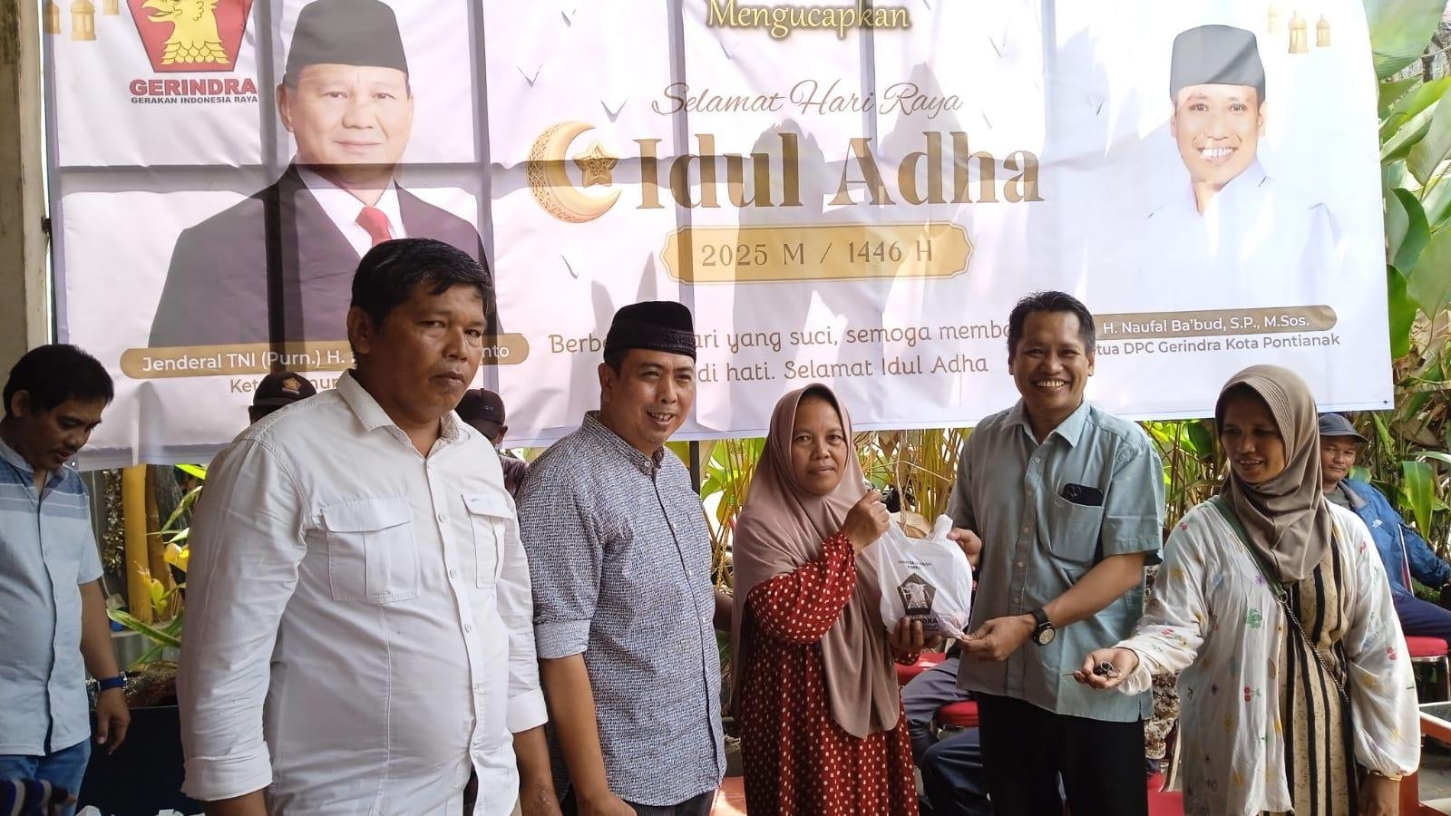 Sebanyak tujuh ekor sapi dan satu ekor kambing dikurbankan dalam kegiatan yang dipusatkan di Kantor DPC Gerindra Kota Pontianak. Ketua DPC Gerindra Kota Pontianak, Naufal Babud, S.Pd., M.Si., menyerahkan secara simbolis hewan kurban kepada Ketua Panitia, Muchammad Faiz, ST, yang memimpin pelaksanaan kurban tahun ini.