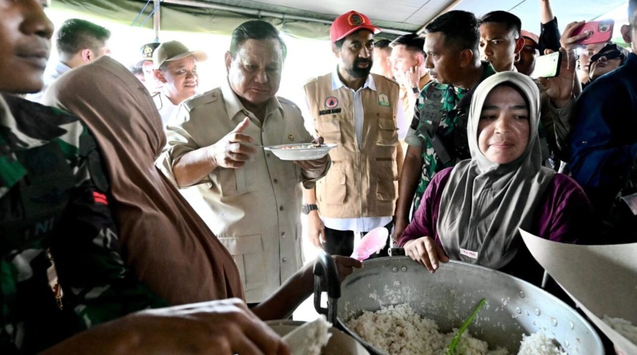 Prabowo juga meninjau dapur umum dan berdialog dengan relawan untuk memastikan suplai bahan makanan tidak terputus. Ia bahkan mencicipi menu yang disiapkan untuk pengungsi, berupa nasi dan ikan tongkol.