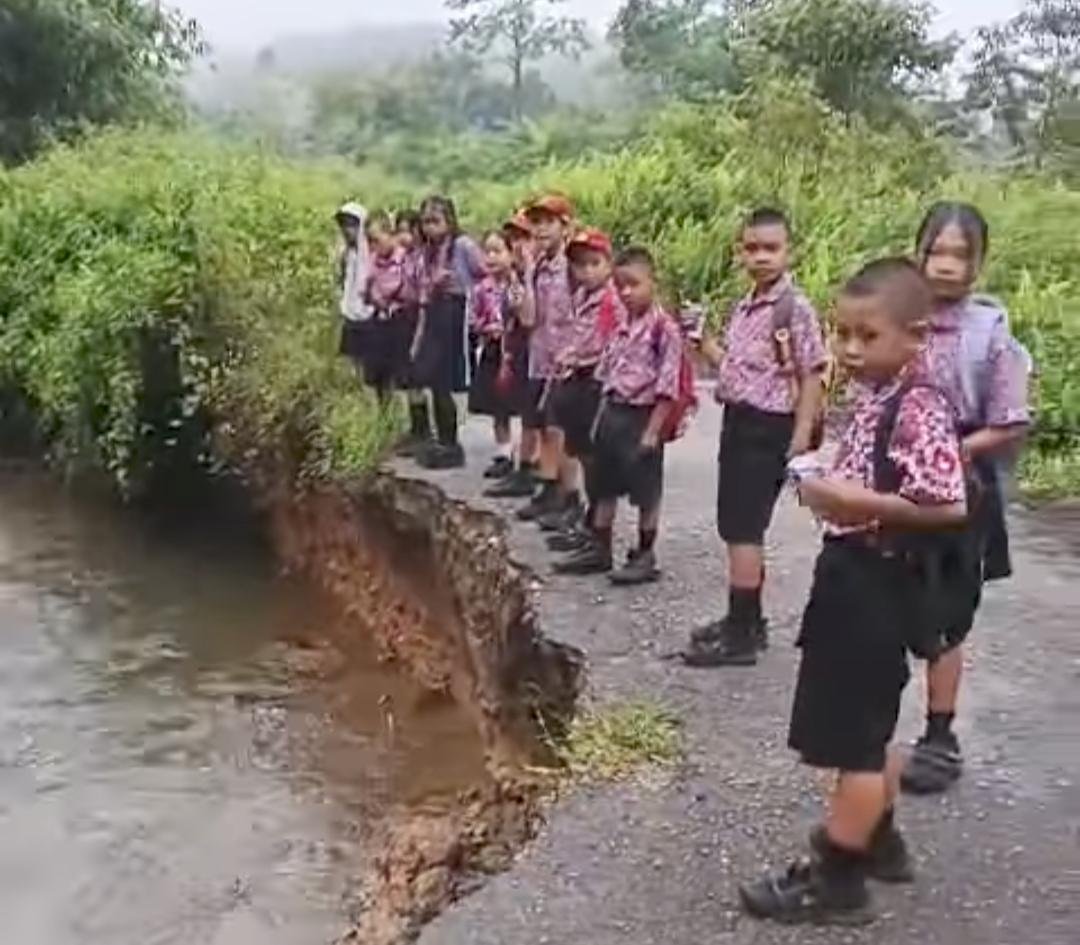 Dalam foto yang beredar, tampak sekelompok pelajar berseragam Batik berdiri di tepi jalan yang amblas, mengamati kondisi jalan dengan wajah penuh kekhawatiran. Debit air yang tinggi diduga menjadi pemicu utama longsornya jalan ini, diperparah dengan kondisi drainase yang kurang memadai.