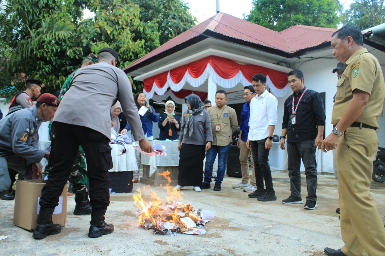 Pemusnahan surat suara dilaksanakan pada pukul 16:30 Wib, Selasa (26/11) sore di Halama Kantor KPU Sangga.