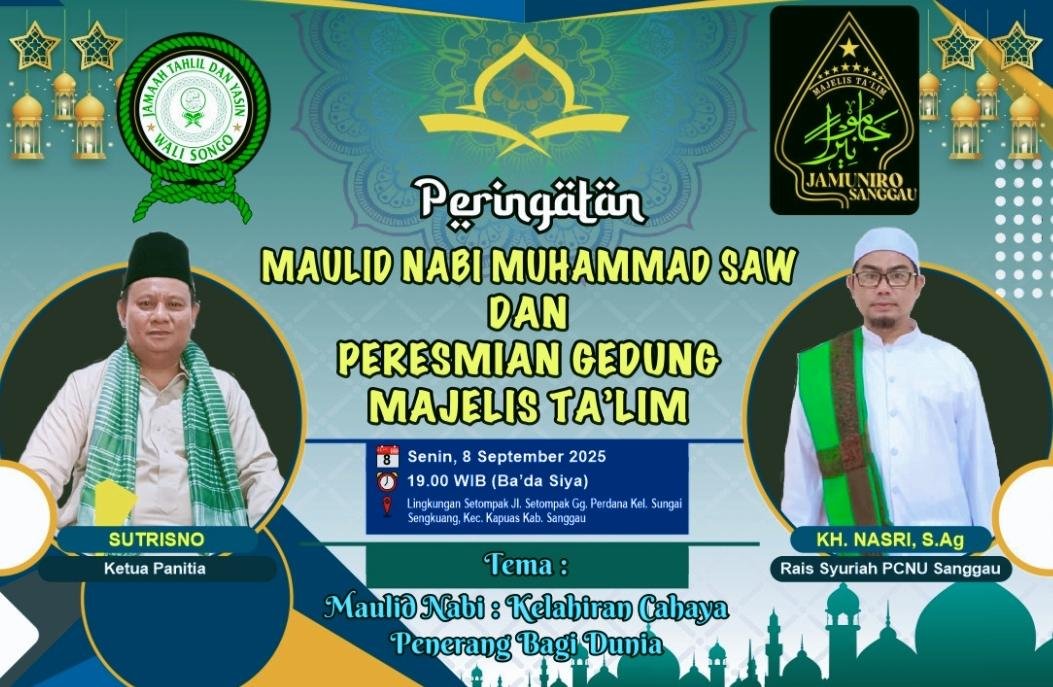 Sanggau, ZONA Kalbar.id – Jamaah Yasin dan Tahlil Wali Songo bersama kelompok sholawat Jamuniro akan menggelar peringatan Maulid Nabi Muhammad SAW sekaligus meresmikan Gedung Majelis Ta’lim Jamuniro. Acara dijadwalkan berlangsung pada Senin, 8 September 2025, selepas salat Isya, di Lingkungan Setompak, Jalan Setompak Permai Gang Perdana, Kelurahan Sungai Sengkuang, Kecamatan Kapuas, Kabupaten Sanggau.