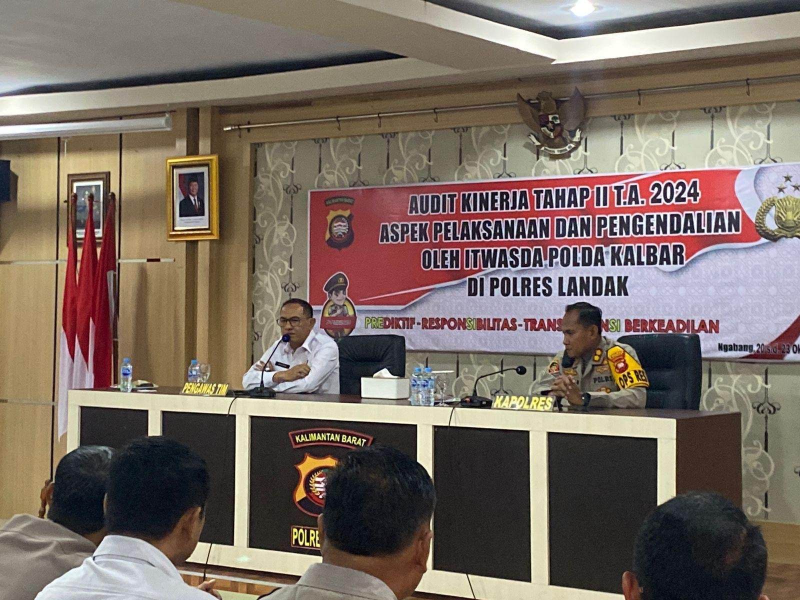 Landak, zonakalbar.id – Inspektorat Pengawasan Daerah (Itwasda) Polda Kalimantan Barat mengadakan Audit Kinerja Tahap II TA.2024. Audit ini bertujuan untuk mengawasi kinerja jajaran di wilayah hukum (Wilkum) Polda Kalimantan Barat. Kegiatan tersebut berlangsung di Aula BKPM Polres Landak dan disambut baik oleh Kapolres Landak, AKBP Siswo Dwi Nugroho, S.H., S.I.K. Kegiatan ini dihadiri oleh Wakapolres Landak, Kompol Syaiful Bahri, S.I.P., M.Sos, bersama para Pejabat Utama (PJU), para Kapolsek, serta personel Polres Landak beserta jajarannya.