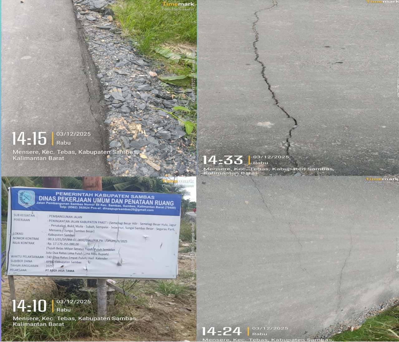 Sambas, ZONA Kalbar.id — Proyek peningkatan jalan di Desa Mensere, Kecamatan Tebas, Kabupaten Sambas, menjadi sorotan publik. Jalan yang menelan anggaran lebih dari Rp17 miliar dan dikerjakan PT Abdi Jasa Tama itu kini terlihat rusak berat, padahal baru beberapa bulan selesai dibangun pada 2025.