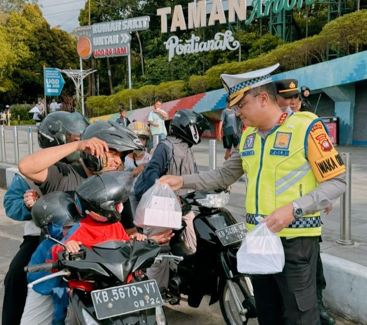 Kegiatan dipimpin langsung oleh Direktur Lalu Lintas Polda Kalbar, Kombes Pol Valentinus Asmoro, bersama sejumlah personel Polwan. Ratusan paket takjil dibagikan kepada pengendara dan masyarakat yang melintas menjelang waktu berbuka puasa.