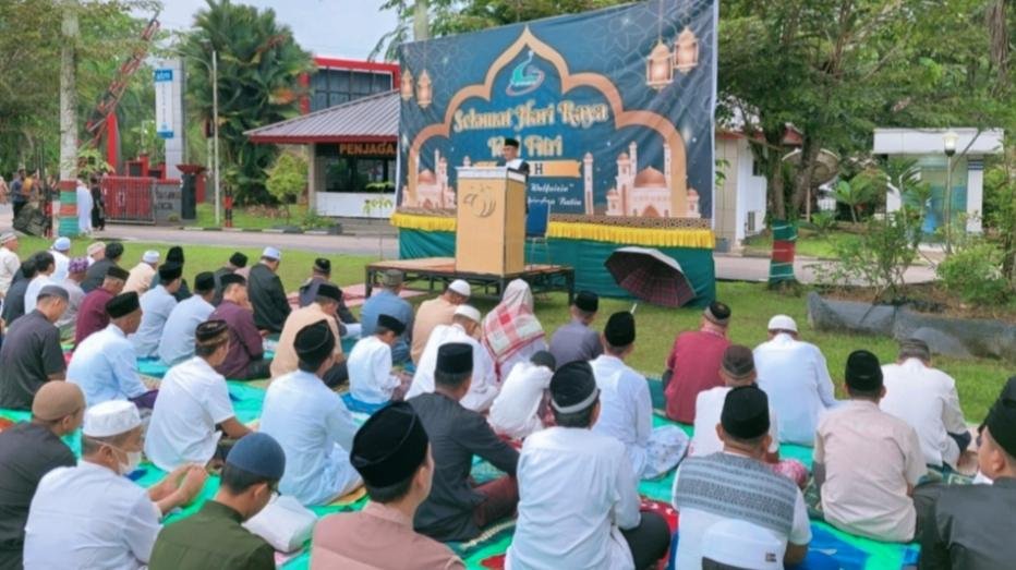 Sejak pagi, masyarakat mulai berdatangan membawa sajadah dan perlengkapan salat. Suasana tampak khusyuk dan tertib. Jemaah laki-laki dan perempuan memenuhi area salat yang telah digelar di halaman terbuka, di bawah naungan pepohonan rindang dan cuaca yang cerah. Sebuah panggung sederhana berlatar ucapan “Selamat Hari Raya Idulfitri” menjadi titik pusat perhatian jemaah.