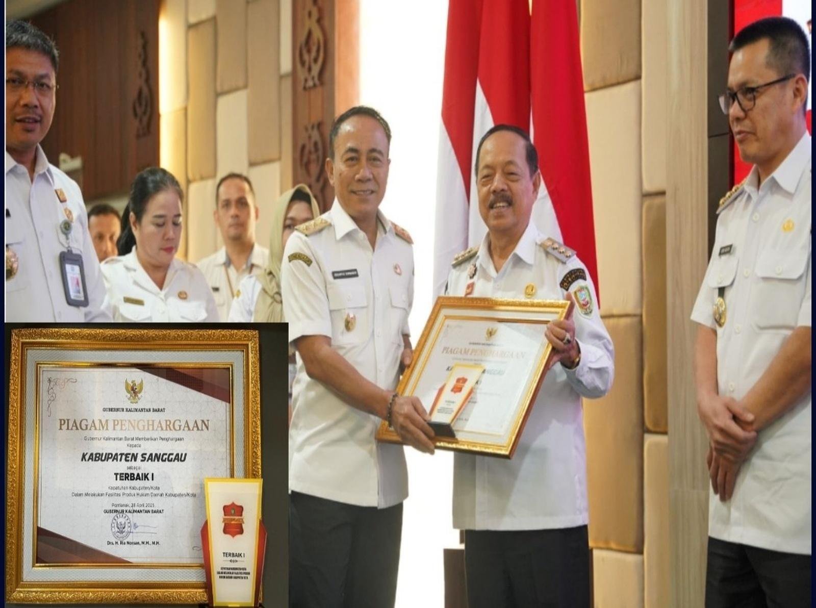 Pontianak, ZONA Kalbar.id – Pemerintah Kabupaten Sanggau menerima penghargaan sebagai Terbaik I dalam kategori Kepatuhan Kabupaten/Kota dalam Melakukan Fasilitasi Produk Hukum Daerah pada Rapat Koordinasi Bidang Hukum dan HAM Provinsi Kalimantan Barat Tahun 2025. Penghargaan tersebut diberikan langsung oleh Gubernur Kalimantan Barat dalam acara yang digelar di Aula Garuda, Kantor Gubernur Kalbar, Rabu (30/4).