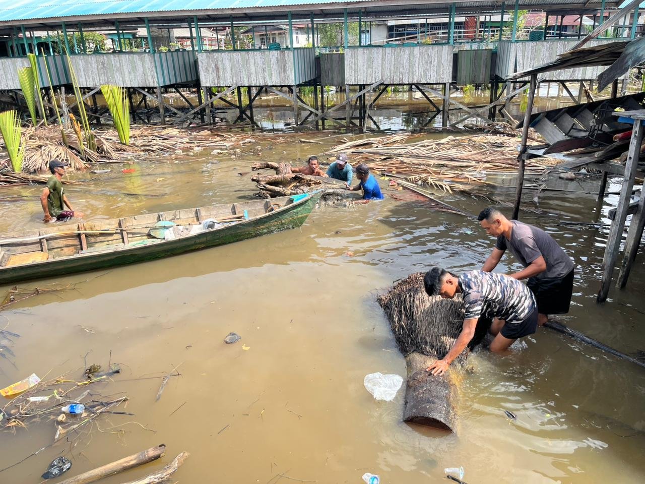 Di Posal Sungai Kakap, personel TNI AL bersama unsur TNI-Polri, aparat desa, Pengawasan Sumber Daya Kelautan dan Perikanan (PSDKP), serta masyarakat membersihkan area Dermaga Tempat Pelelangan Ikan (TPI) Desa Sungai Kakap. Kawasan tersebut merupakan titik aktivitas utama nelayan setempat.